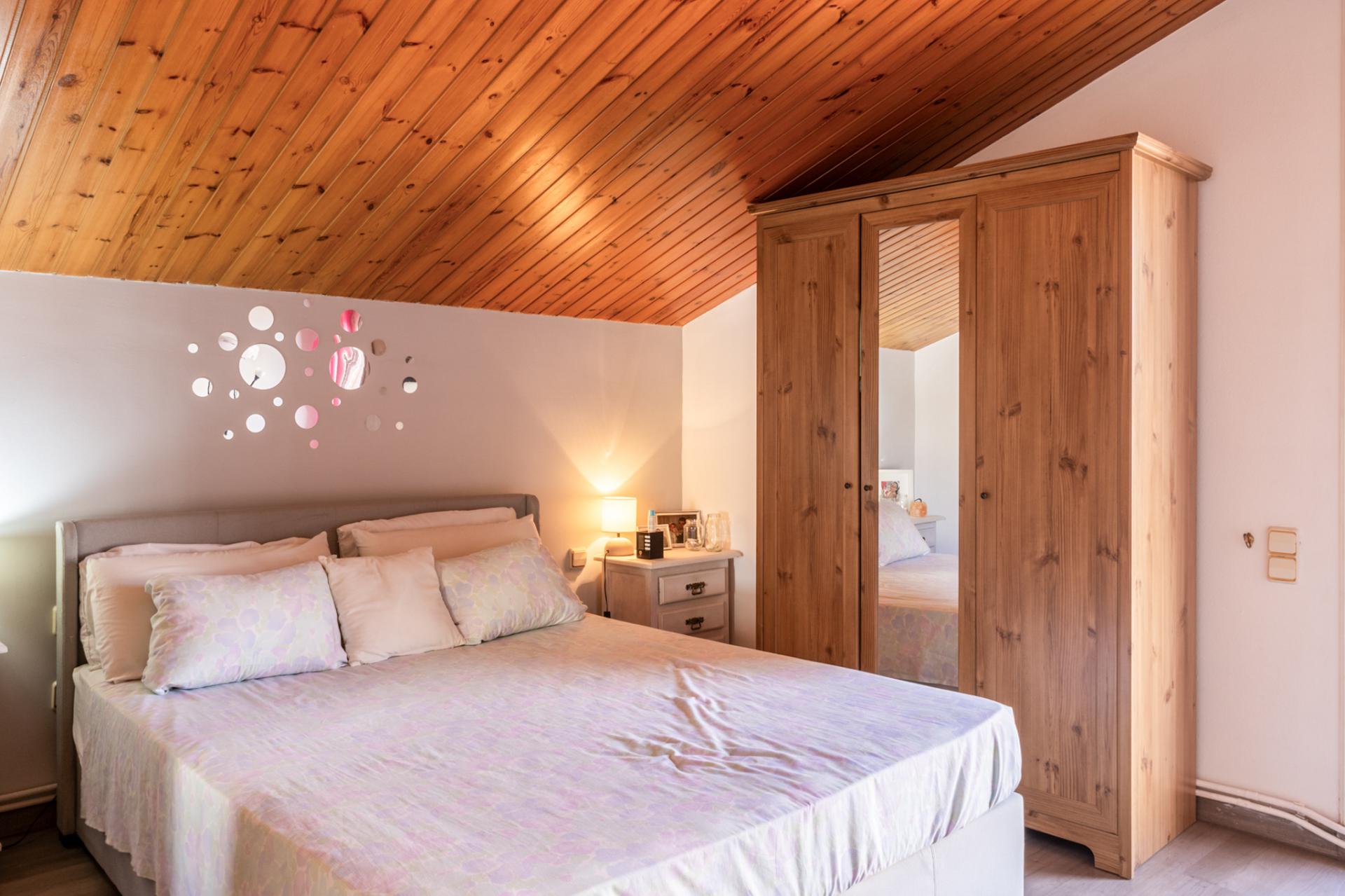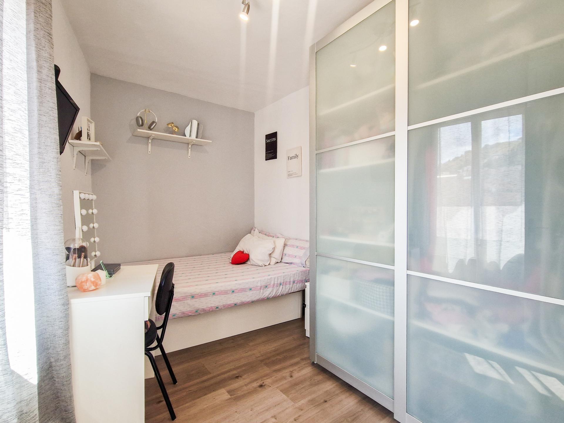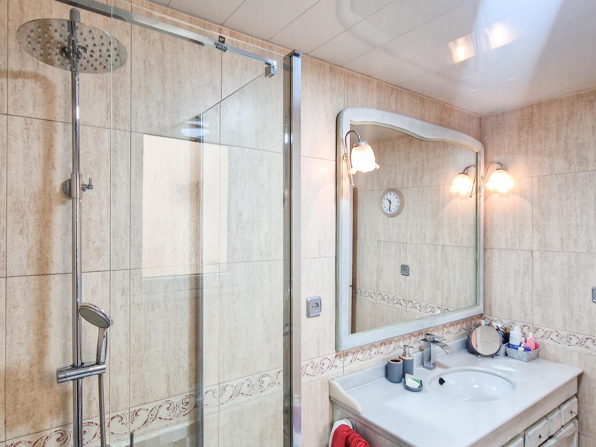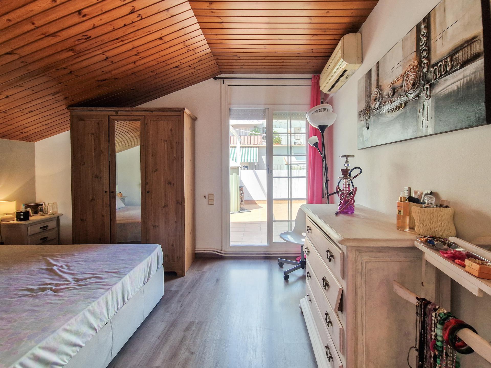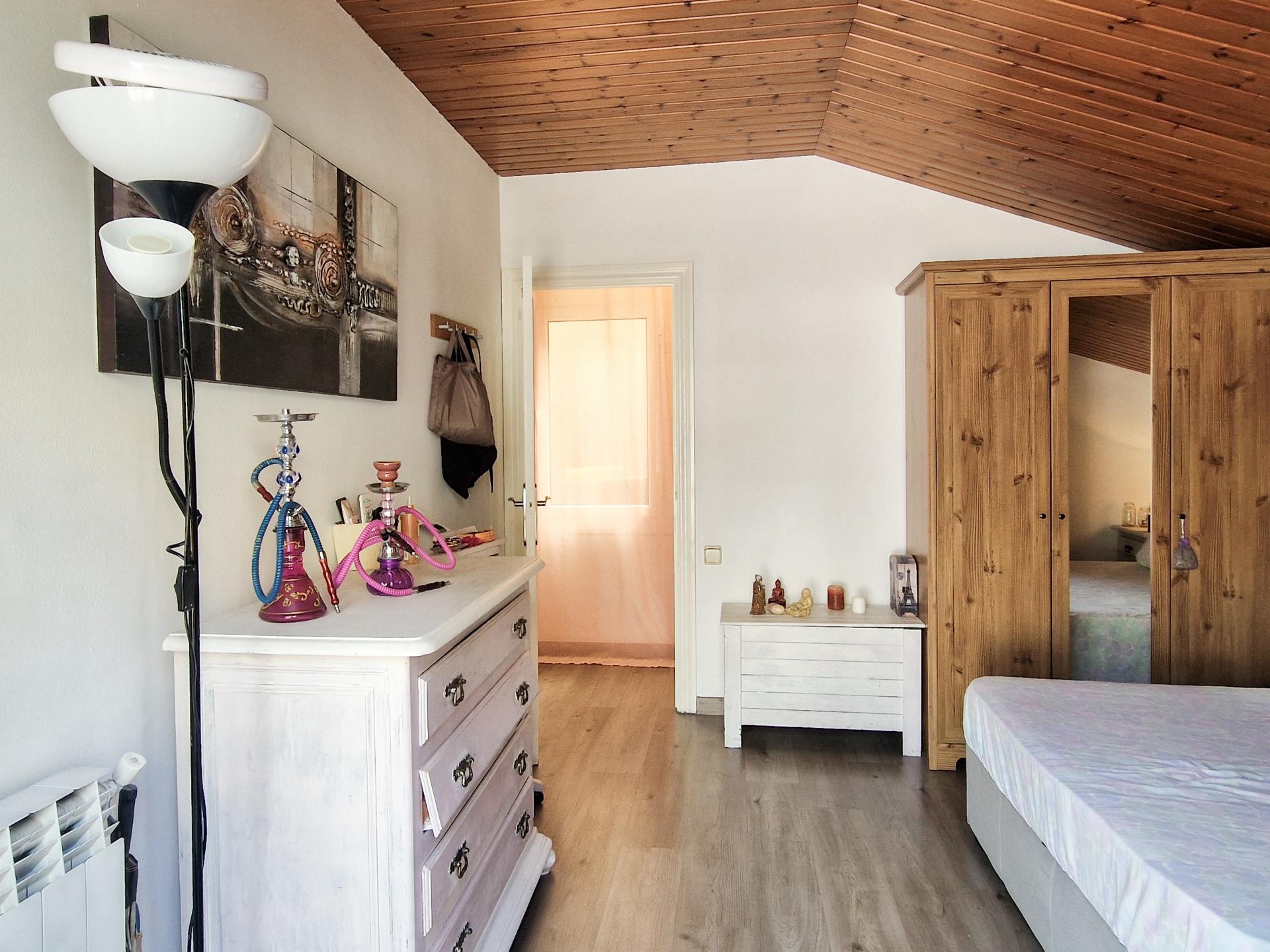 Subimos a la planta superior y nos encontramos con 3 habitaciones dobles, una de ellas con salida a la terraza de 40m2 aprox., una sala polivalente, también con salida a una terraza de 15 m2 aprox., y un baño completo con plato de ducha doble.