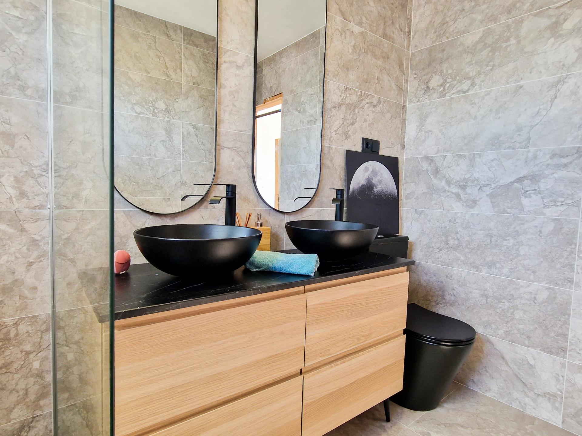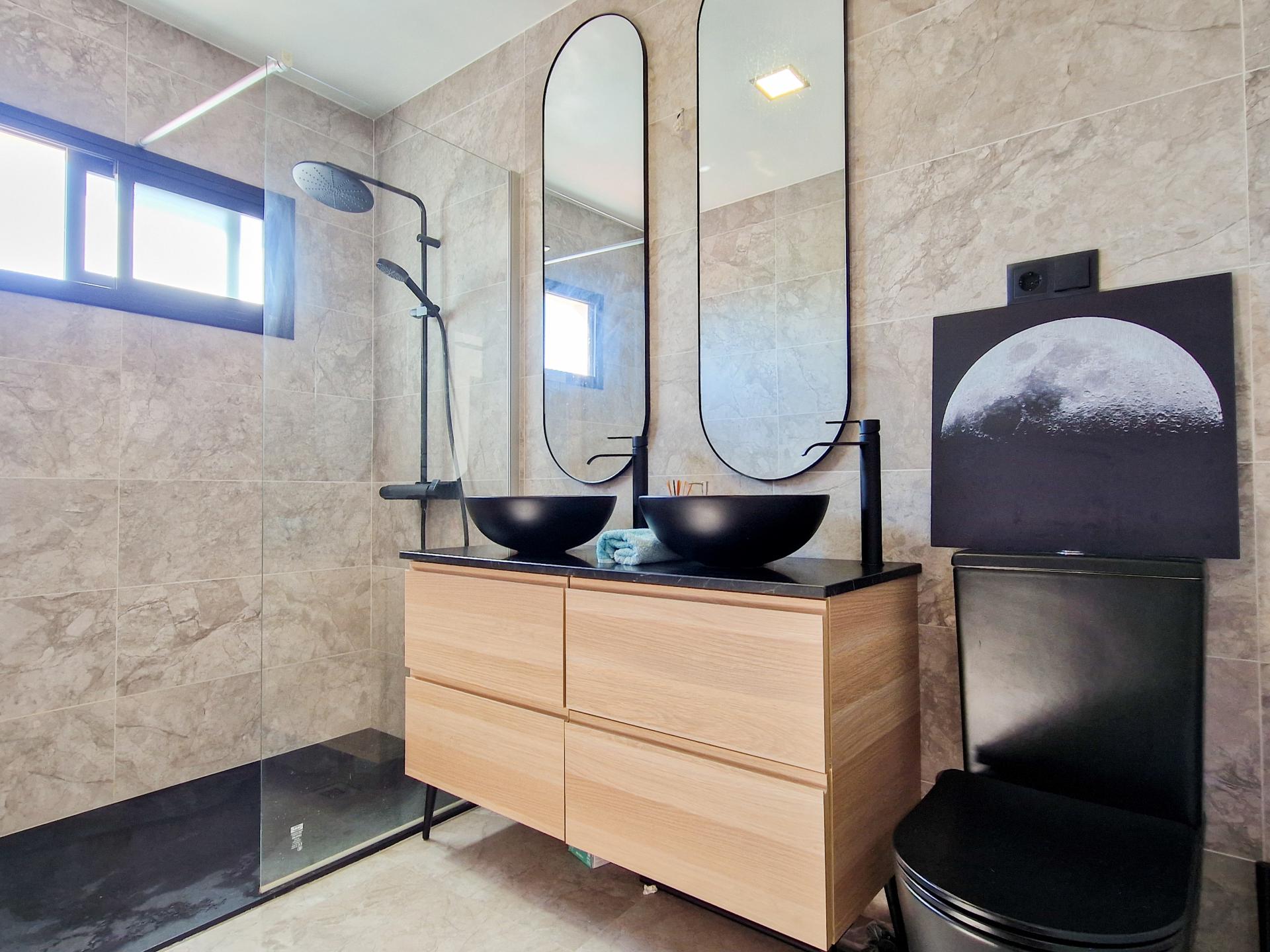 Tiene un dormitorio doble muy completo y un baño exterior con plato de ducha doble.